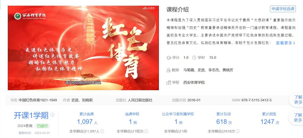自2023年4月《红色体育》课程获批陕西特色线上课程建设项目以来,在学校的支持下,马克思主义学院积极组织《红色体育》线上课程资源建设。课程于2024年2月23日在智慧树在线教育平台正式上线运行。截至目前,该课程的选课人数为1097人,运行效果良好。