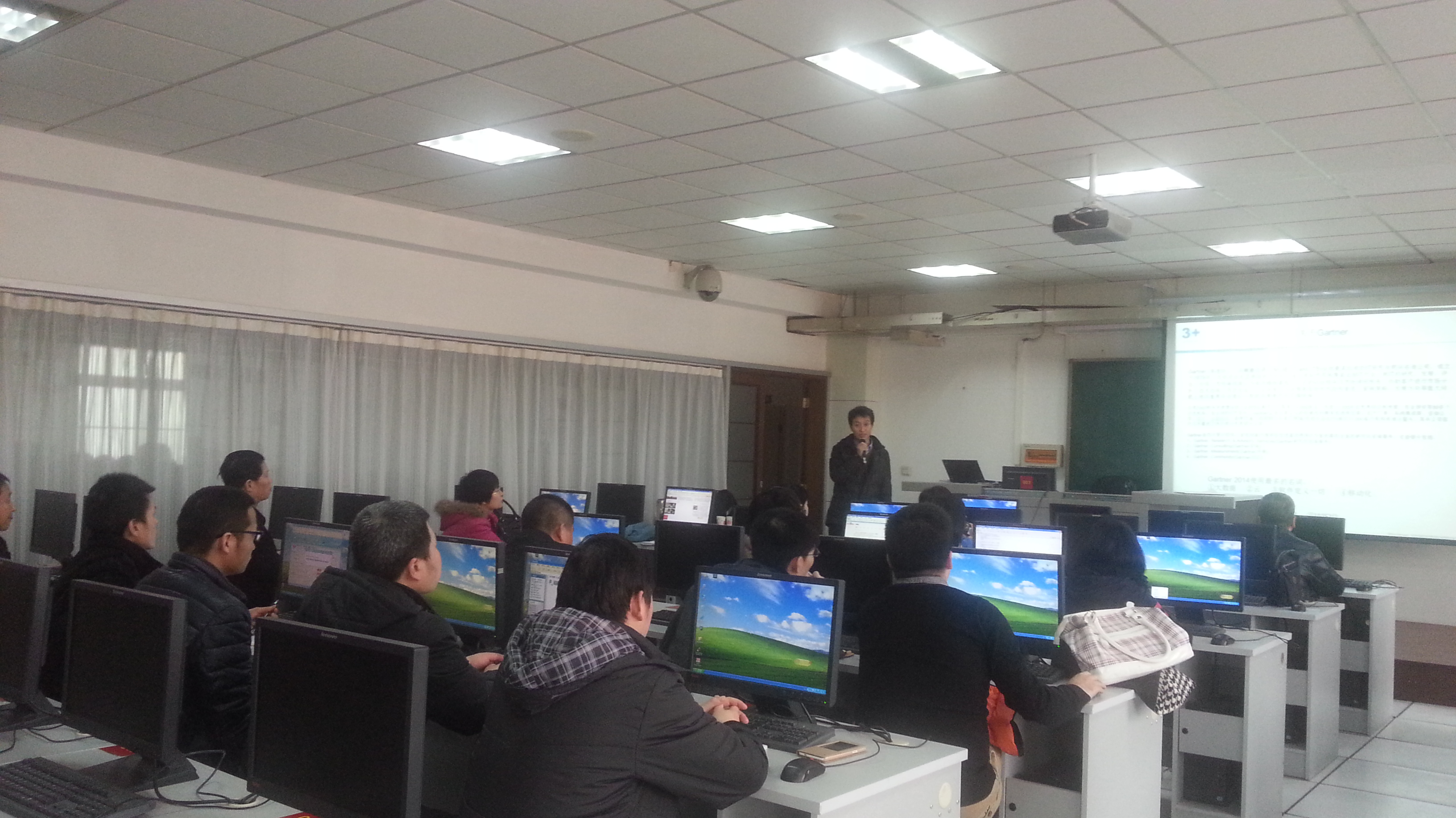 2015年1月14日下午3点,网络管理中心全体成员在教学楼604教室进行了网络新技术培训。本次培训特别邀请了西安三佳计算机网络有限公司技术总监曹亚峰高级工程师主讲。他主要针对近年来网络发展的新技术,如大数据,云,软件定义一切,移动互联网和IPv6等,结合现实应用情况和未来发展趋势进行了生动形象的讲解。